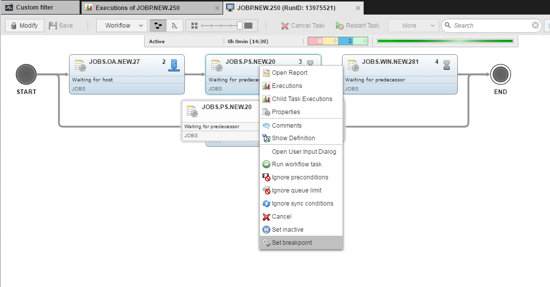 If you activate this checkbox, the workflow stops at this task. The status of the workflow changes to Workflow is blocked. To continue processing it you must open the Workflow monitor and delete the breakpoint manually: |