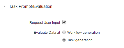 By default, the prompt sets of workflow tasks are not displayed on screen and user interaction is not required while the workflow is being executed; the default values specified in the Prompts Tab. This is important to avoid unnecessary interruptions. However, there can be situations in which you want to change this behavior. Activate the Request User Input checkbox if you want the task prompt sets to be displayed on screen requesting the user to enter values. |