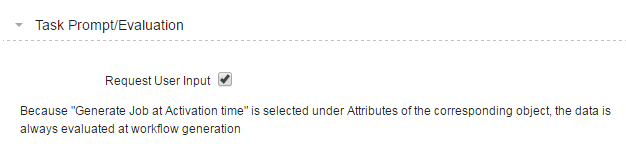By default, the prompt sets of workflow tasks are not displayed on screen and user interaction is not required while the workflow is being executed; the default values specified in the Prompts Tab. This is important to avoid unnecessary interruptions. However, there can be situations in which you want to change this behavior. Activate the Request User Input checkbox if you want the task prompt sets to be displayed on screen requesting the user to enter values. |