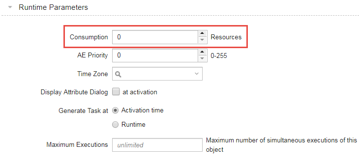 The resource consumption of Jobs and File Transfers that should not use the default value can be specified in the object Attributes Page. If you enter 0, the default value of the UC_SYSTEM_SETTINGS variable is used.