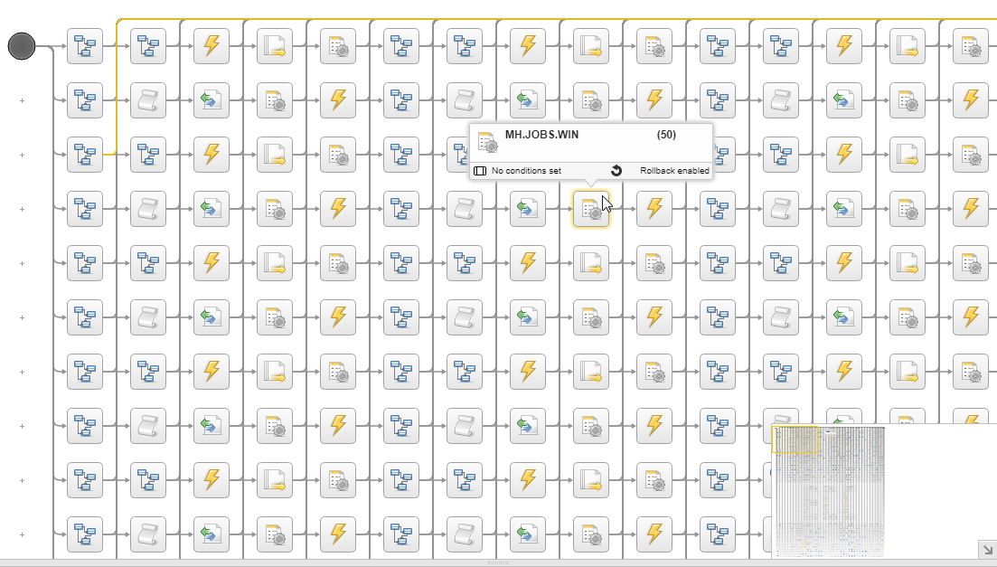Large workflows spread over the visible part of the Workflow editor/monitor. In case of Workflows that contain hundreds of tasks, panning is not enough to get an overview of the Workflow. In these cases, a mini map at the bottom right corner of the screen helps you orientate within them.