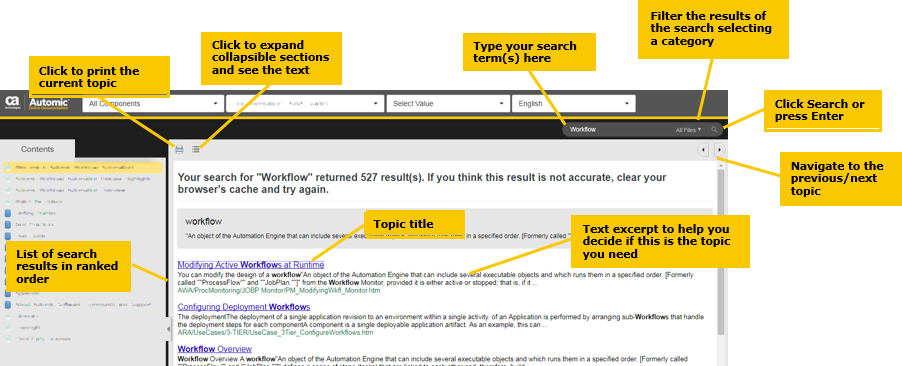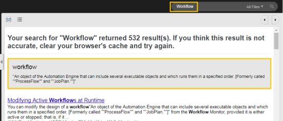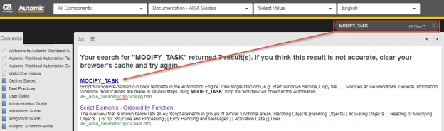 Automic's online help opens up and the selected element is automatically inserted in its Search field. The search is also automatically started and the list with its results is displayed.