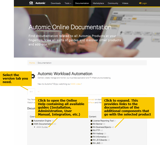 Clicking on the product box opens a product-specific page where you can select the version you are interested in. Select the tab that corresponds to your version; there you will find the links to the documentation. The image below illustrates how the AWA documentation page works, but it is exactly the same for all other products: