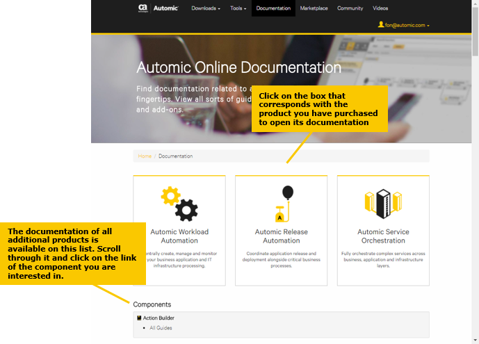 In addition to opening the help from within the application (see Context-Sensitive Help) you can find it at docs.automic.com. This link opens the Automic Online Documentation center, where you will find the documentation of all Automic's products: