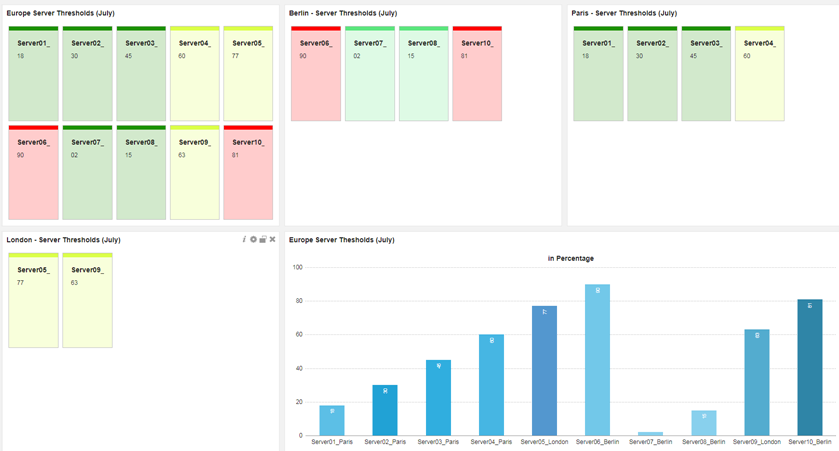 The following example shows our final dashboard with all server thresholds assigned. The first grid on the left displays the entire VARA object data. The other three grids Berlin, Paris, and London are data subsets of the same VARA object. The displayed chart was added using the VARA to Chart feature. See: Creating charts using VARA Objects .