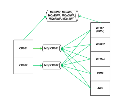 Each CP within an AE system has its own communication queue and processes the tasks in the queue. The WPs store all external tasks for the agents and Automic Web Interface instances in this queue.