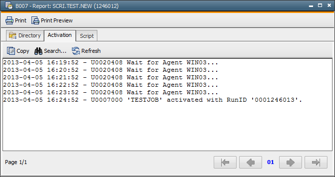 If the agent is available again, the verification (SYS_HOST_ALIVE) returns the value "Y". The loop ends and the scripting line that activates the job "TESTJOB" (script function ACTIVATE_UC_OBJECT) is read. The activation protocol indicates whether the system is still waiting for the agent or whether the job has already been activated.