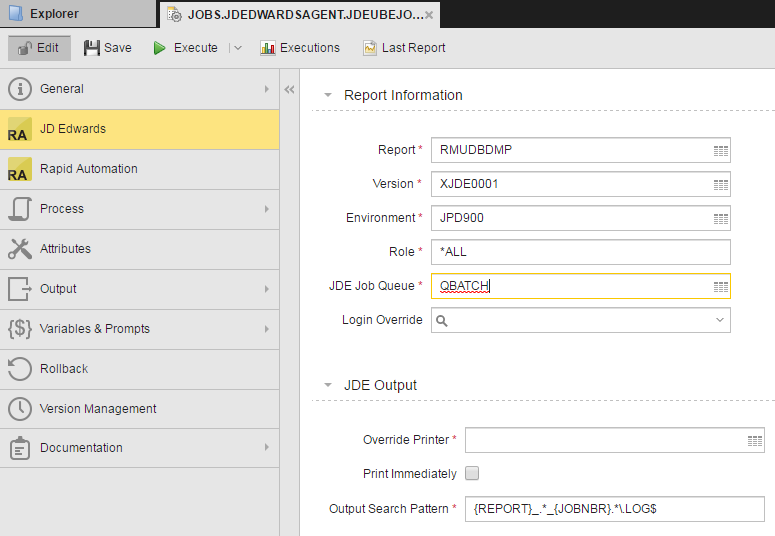 Create JDEUBEJOB jobs to run UBE jobs. UBE jobs include a special JD Edwards tab where you can enter program, output and parameter information.