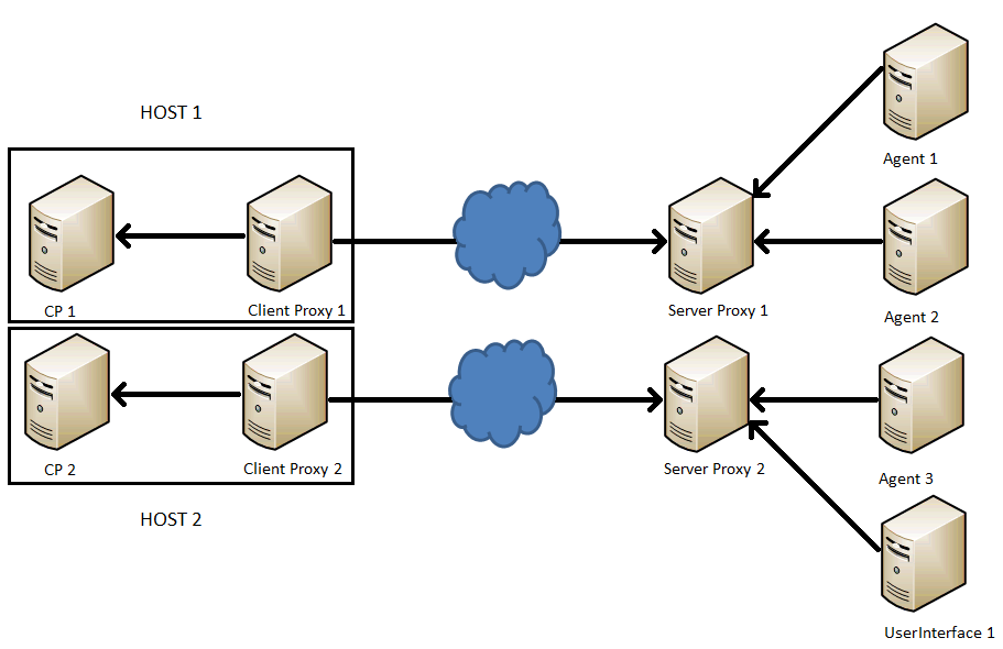 Nested Proxies are not supported. For example, it is not possible to route the agent over two Proxies: Agent > ProxyServer < ProxyClient > ProxyServer < ProxyClient -> CP process.