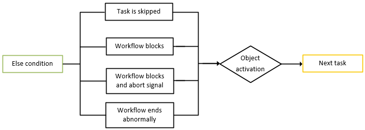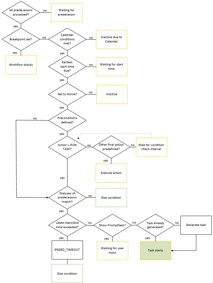 The graphics in this topic illustrate the internal processes that tasks undergo when they are part of a Workflow. In the following graphics, green ELSE Condition processes indicate that sub processes start. The Description sections after the graphics provide an explanation of the processes. They also contain links to the related topics in the documentation.