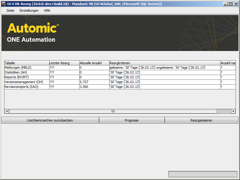 Es besteht die Möglichkeit, vor der eigentlichen Reorganisierung eine Prognose durchzuführen. Entsprechend den Einstellungen werden die zu reorganisierenden Datensätze gezählt und die Ergebnisse nach Tabellen getrennt angezeigt.