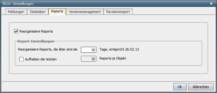 Sie können auch einstellen, dass zumindest die letzten n Reports des Objektes nicht reorganisiert werden. Das ist vor allem für Aufgaben sinnvoll, die nicht derart häufig durchgeführt wurden. „Aufheben der letzten...“ bezieht sich auf den Reorganisationszeitraum. Es bedeutet daher nicht, dass alle Reports bis auf die letzten n Reports reorganisiert werden! Vielmehr prüft das Dienstprogramm, wieviele Reports in den Reorganisationszeitraum fallen, und hebt die letzten n Reports auf. |