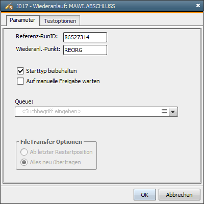 Mit dem Wiederanlauf-Text legen Sie eine Beschreibung des Wiederanlauf-Punktes fest, die in den Durchführungsprotokollen als zusätzliche Information ausgegeben wird. Die Angabe des Wiederanlauf-Textes ist optional.