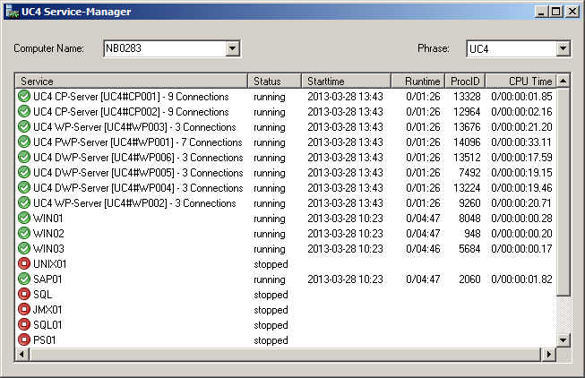 Das Dialogprogramm zeigt Ihnen den Status der Komponenten einer ServiceManager-Umgebung. Letztere wird auch als Phrase bezeichnet. Mit dem Dialogprogramm können auch ServiceManager erreicht werden, die auf anderen Rechnern im Netzwerk laufen. Somit bietet es die Möglichkeit, systemweit auf Windows und UNIX basierte AE Programme zuzugreifen. Selbstverständlich werden für die Zugriffe auf ferne Rechner die erforderlichen Rechte vorausgesetzt und geprüft.