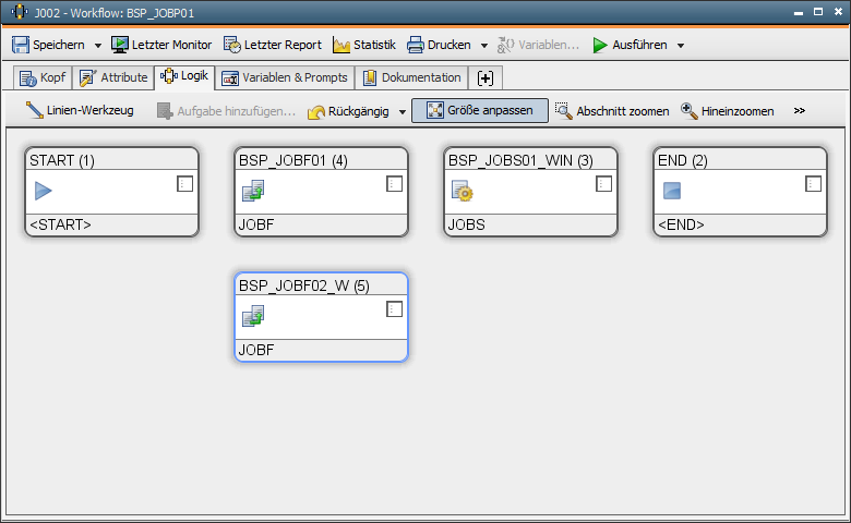Es gilt, dass ein Objekt eines Workflows erst dann aktiviert wird, wenn alle seine Vorgänger beendet worden sind. Der Job startet also erst, nachdem die Dateien der ersten beiden FileTransfers übertragen wurden.