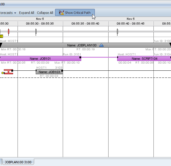 2. Wir navigieren zum Aufgabenbalken "JOBPLAN3" und erweitern diesen. Dieser Workflow enthält drei untergeordnete Aufgaben (siehe unten). Beim realistischen Prognose-Modus endet der Workflow um 09:05:02 Uhr.