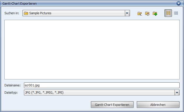 Wenn Sie in der Symbolleiste des Gantt-Diagramms auf die Schaltfläche Export klicken, wird ein Dialog geöffnet, über den Sie den Speicherort, Namen und Typ der zu exportierenden Bild-Datei angeben können. Derzeit werden die Bildformate .JPG und .PNG unterstützt.
