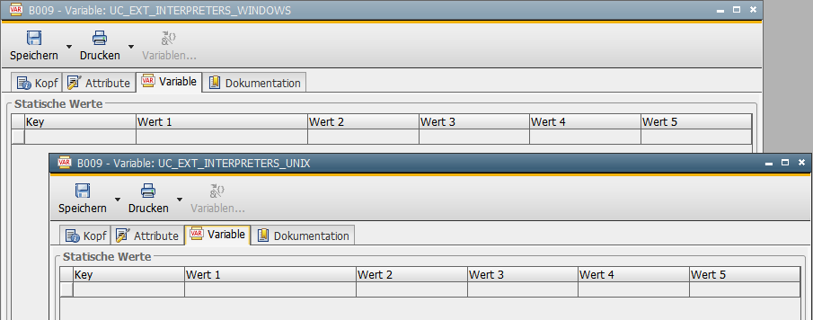 Das folgende Bild zeigt die Systemvariablen UC_EXT_INTERPRETERS_WINDOWS bzw. _UNIX (vorne UC_EXT_INTERPRETERS_UNIX, Registerkarte "Variable"):
