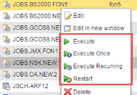 Es gibt verschiedene Möglichkeiten, Objekte manuell auszuführen: sofort, einmalig, periodisch, Neustart. Dies variiert je nach ObjekttypFür jede Tätigkeit existiert ein eigenes Objekt: Agent, Benachrichtigung, Benutzer, BenutzerGruppe, Cockpit, CodeTabelle, Dokumentation, Ereignis, FileTransfer, Gruppe, Include, Job, Workflow, Kalender, Login, Mandant, RemoteTaskManager, Schedule, Script, Server, Sync, Variable und ZeitZone.. Dieses Kapitel besteht aus zwei Teilen. Im ersten Teil werden die verschiedenen Ausführungsarten beschrieben, die für die meisten Objekttypen verfügbar sind. Im zweiten Teil finden Sie objektspezifische Informationen zum Ausführen und Neustarten von Aufgaben.