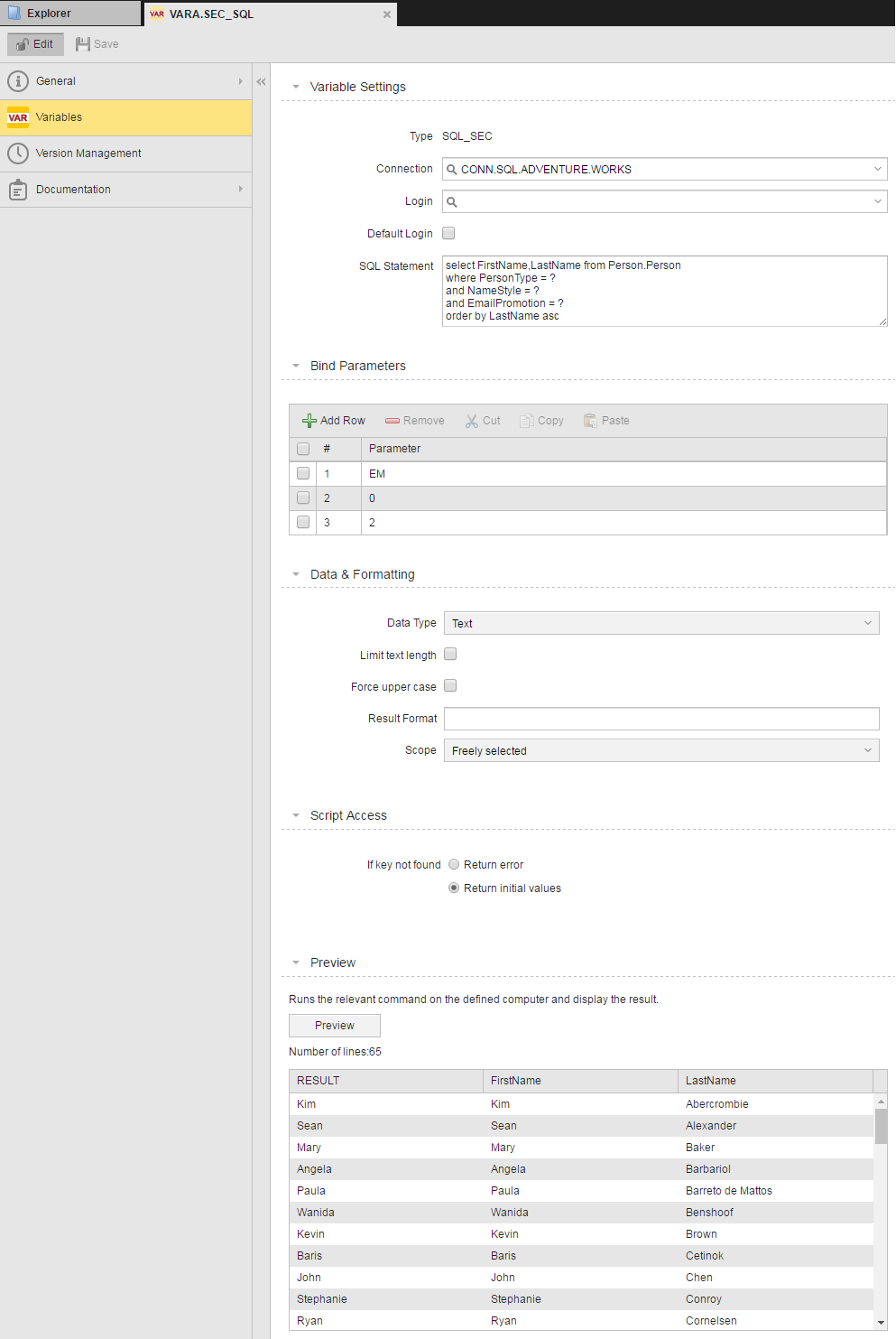 Das besondere Verhalten der Variablenersetzung gilt nur für die SQL-Statements. Um PromptSet-Variablen in den Feldern „Verbindung“ und „LoginAnmeldedaten für Zielsysteme. Auch ein eigener Objekttyp in der Automation Engine.“ verwenden zu können, ist die Einstellung VAR_SECURITY_LEVEL = 3 weiterhin erforderlich.
