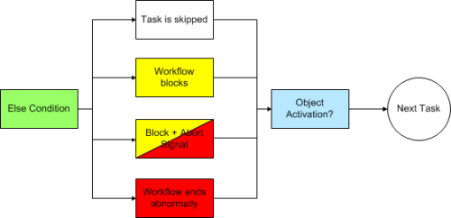 Machen Sie auch von der Einstellung Gebrauch, Abhängigkeiten zu den Ergebnissen der direkt vorangegangenen Aufgaben zu definieren. Im Abschnitt „Else“ werden die Behandlung der Aufgabe und der weitere Verlauf des Workflows für den Fall bestimmt, dass eine bzw. alle der Abhängigkeitsbedingungen nicht erfülltErfüllt bezeichnet den Status eines SLA, den dieser einnimmt, wenn die im SLA definierten Zeitbedingungen erfüllt wurden. Dies bedeutet, dass der Prozess oder die Ereignisse bis zu dem im SLA angegeben Zeitpunkt oder innerhalb des im SLA angegebenen Zeitraums ausgeführt wurden. Das Gegenteil von erfüllt ist verletzt. sind. Eine Aufgabe wartet immer, bis alle ihre direkten Vorgänger durchgeführt worden sind. |
